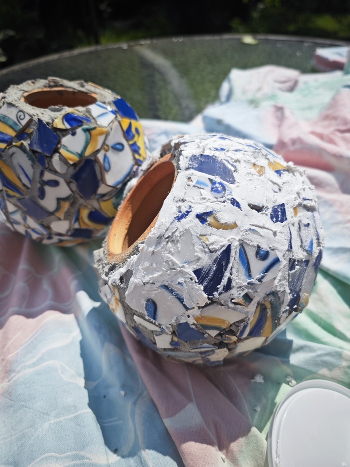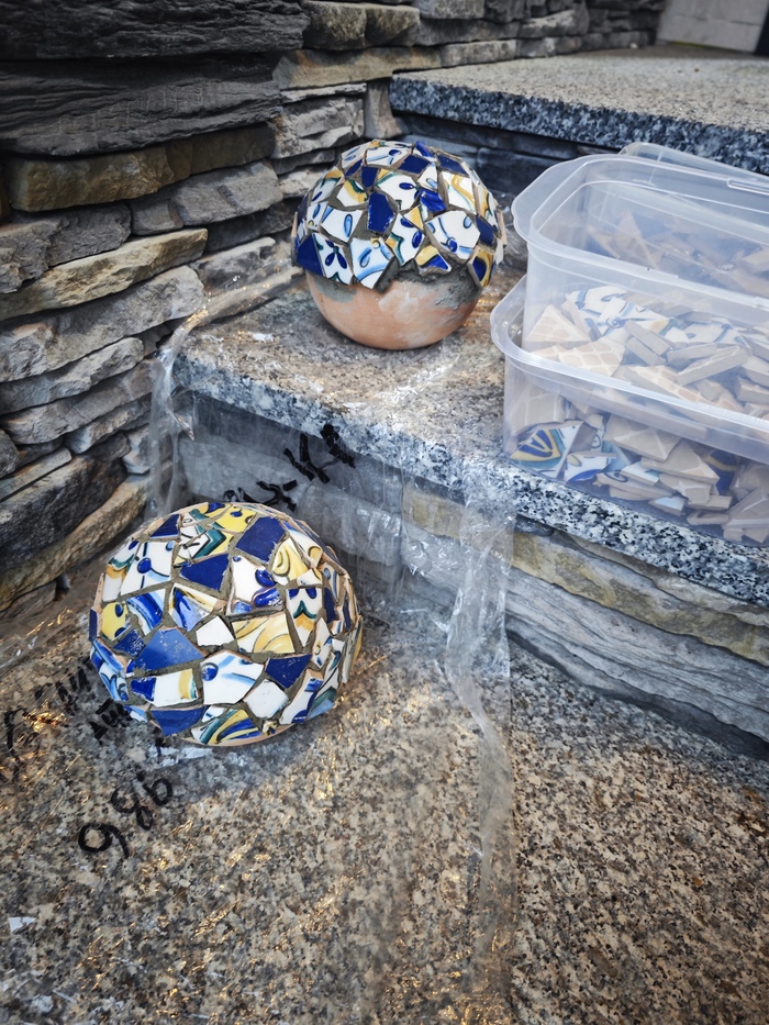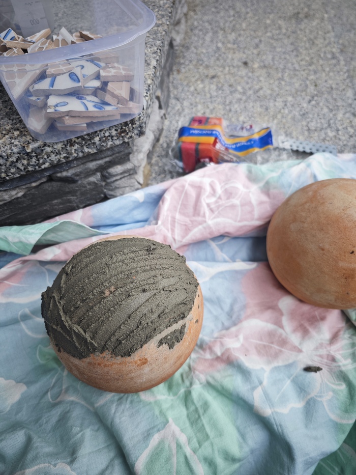 У рабочих, так удачно кладущих в этот момент плитку у нас на дорожках, выпросила грунтовку и плиточный клей. Загрунтовала шары и начала выкладывать кусочки мозаики. Офигенно залипательное занятие, прям рекомендую для психологической разгрузки.