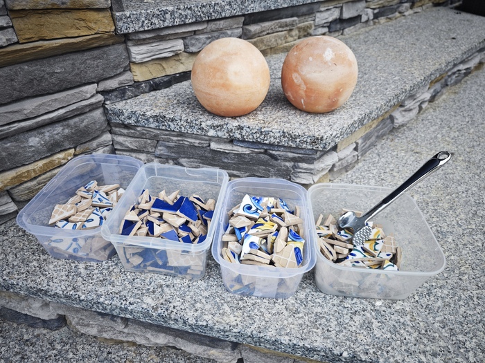 У нас было два пакетика затирки, несколько декоров, оставшихся от отделки, плиточный клей и два глиняных шара, купленных на распродаже с неизвестной целью. Не то, чтобы всё это было категорически необходимо на даче, но если уж начал заниматься дизайном, то к делу надо подходить серьёзно.