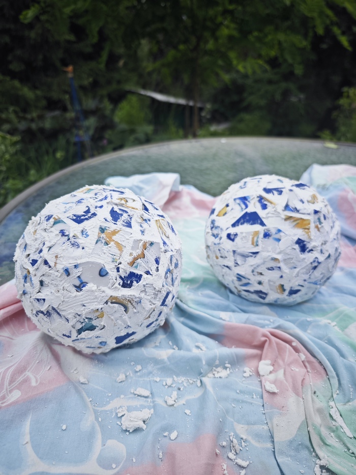 За ночь всё высохло и утром доделала нижнюю часть шариков. Оставила ещё на день сохнуть. Заказала резиновые шпатели для затирки на богомерзком Озоне.