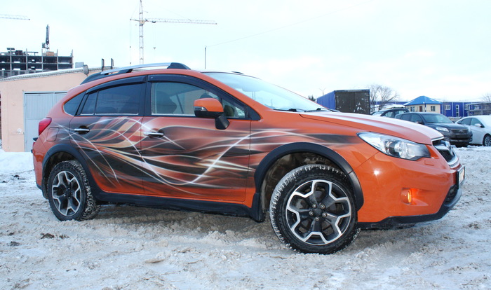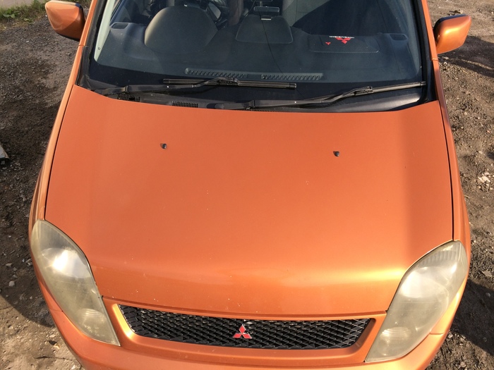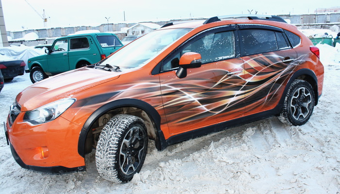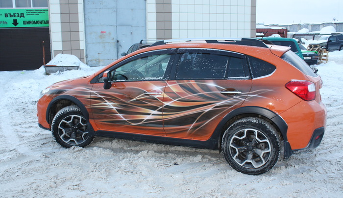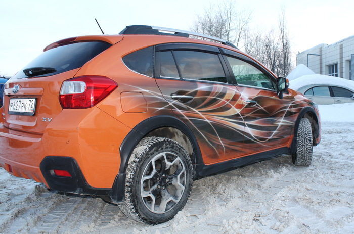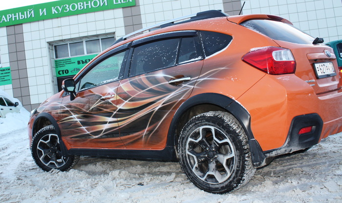 Самое сложное в данной работе, как то подружить рисунок с родным цветом автомобиля. Металик,да еще и оранжевый. Но, вроде бы, справились.