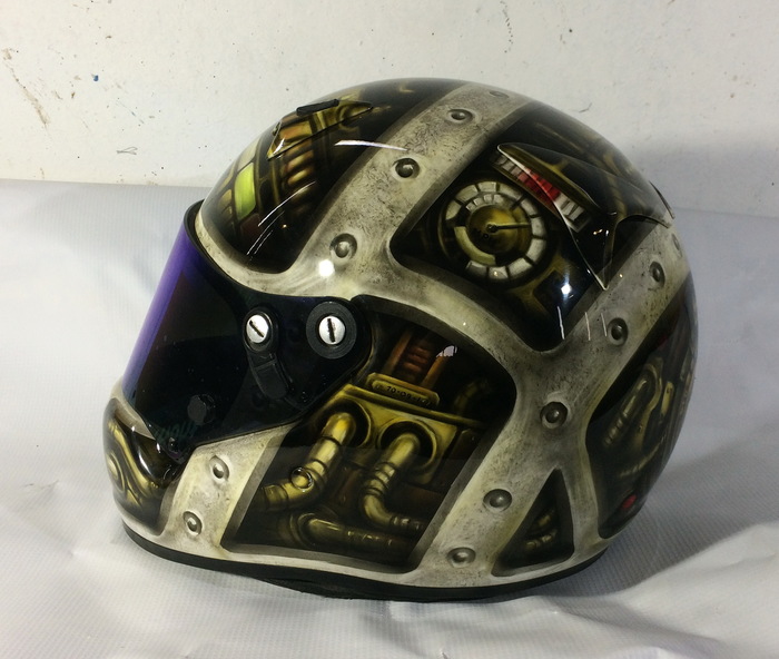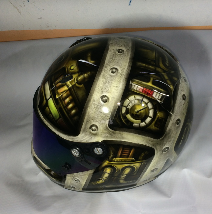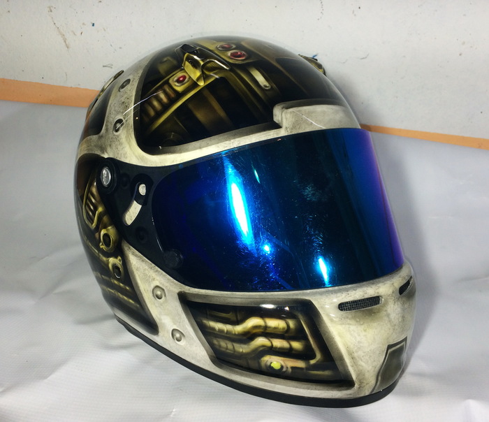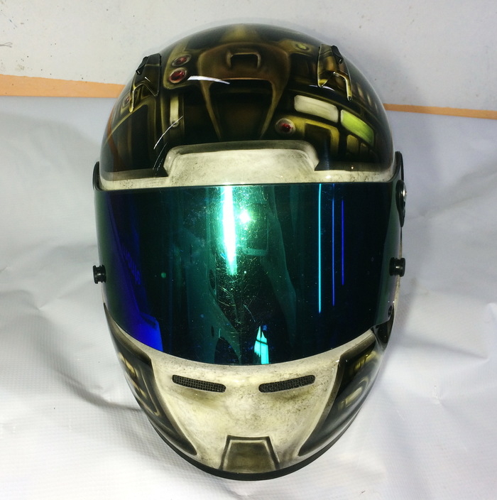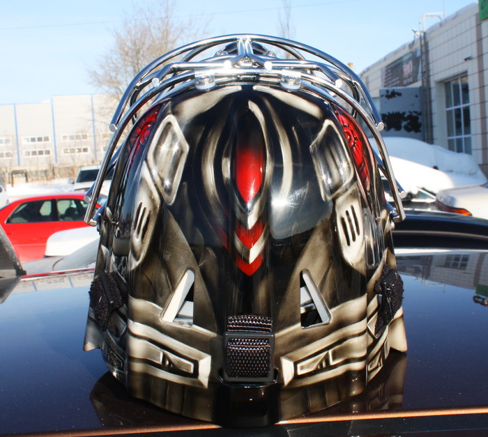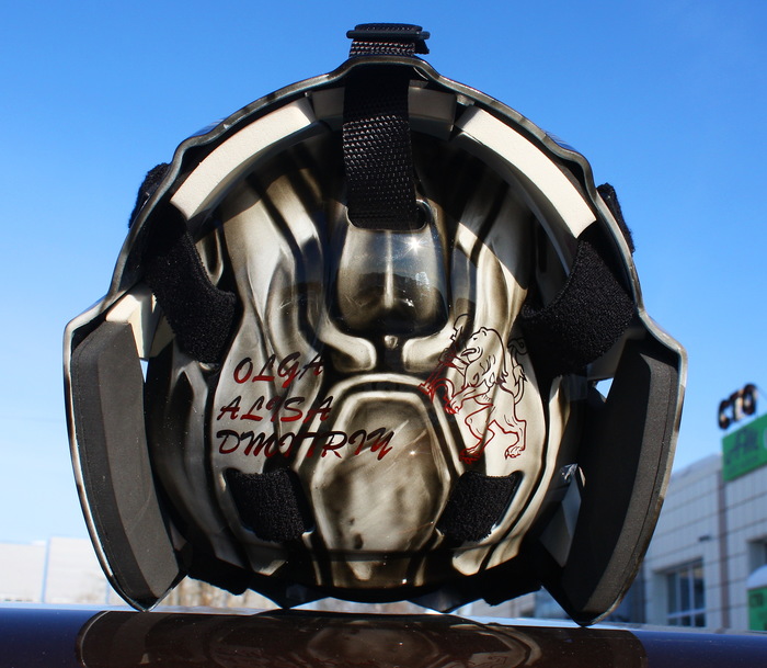 Что на шлеме... Фон- надпись УФА на русском и башкирском, Лого команды с двух сторон, впереди игровой номер. На правой "щеке", стилизованное изображение памятника Салавату, гп левой, петропавловской крепости. Команда Уфимская, обладатель шлема родом из Питера. Сверху драконы, плещущие энергией, в виде молний.