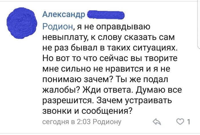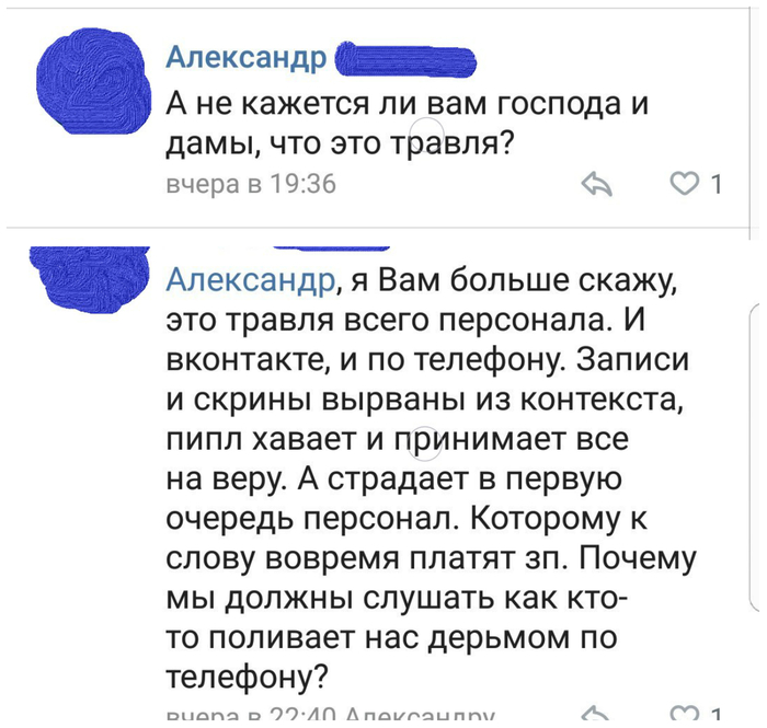Я разместил предупреждения о недобросовестности работодателя для коллег в тематических группах ВК, и тут стало еще интереснее: оказалось, что работники заведения виноватым в невыплате зп считают меня, якобы потому что я повел себя (цитата): "как говнецо человек". Посыпались обвинения о том, что я порчу репутацию не только заведению, но и его работникам. Подтянулись друзья и знакомые заведения.