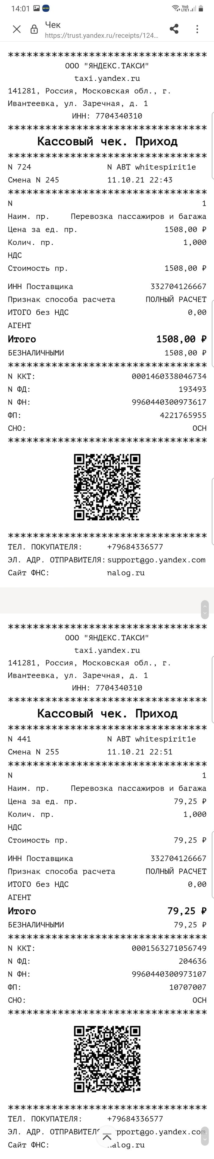 Что мы тут видим? Поездка на 1664,25. Разделена на 2 чека. Сама поездка и чаевые. Но вот только сама поездка стоила 1585р, а не 1508. Как раз 10%.