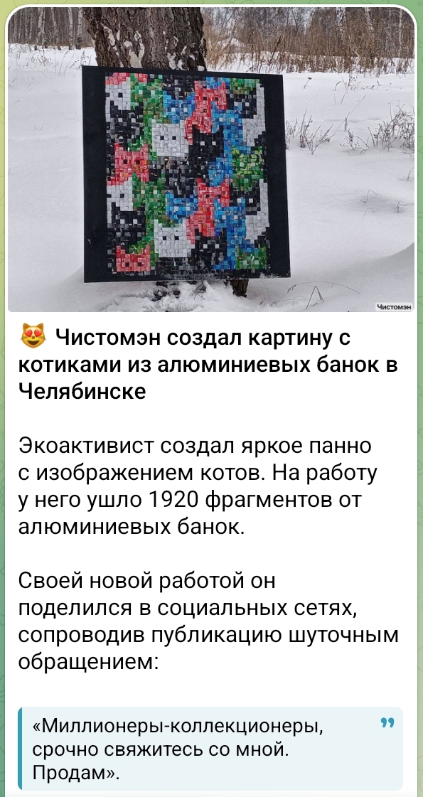 Чистомен создал картину из алюминиевых банок с котиками. И этот в "творчество" подался