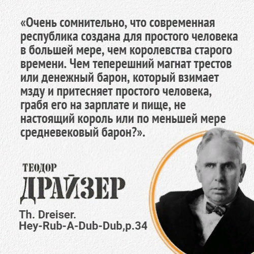 Драйзер уподобляет Соединённые Штаты Америки по их реакционности и всевластию капитала королевствам феодального средневековья: