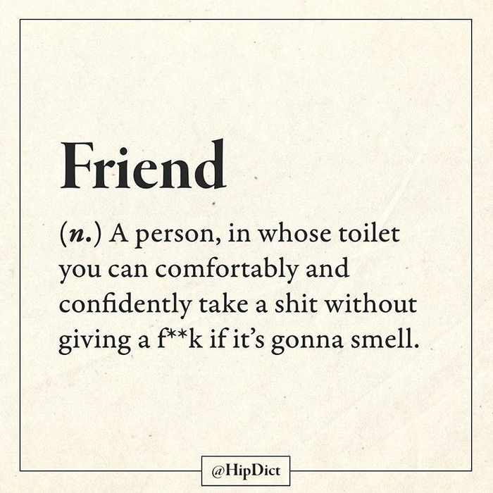 ДРУГ - человек, дома у которого вы можете спокойно и уверенно сходить посрать, совершенно не парясь по поводу вони в туалете после вас.