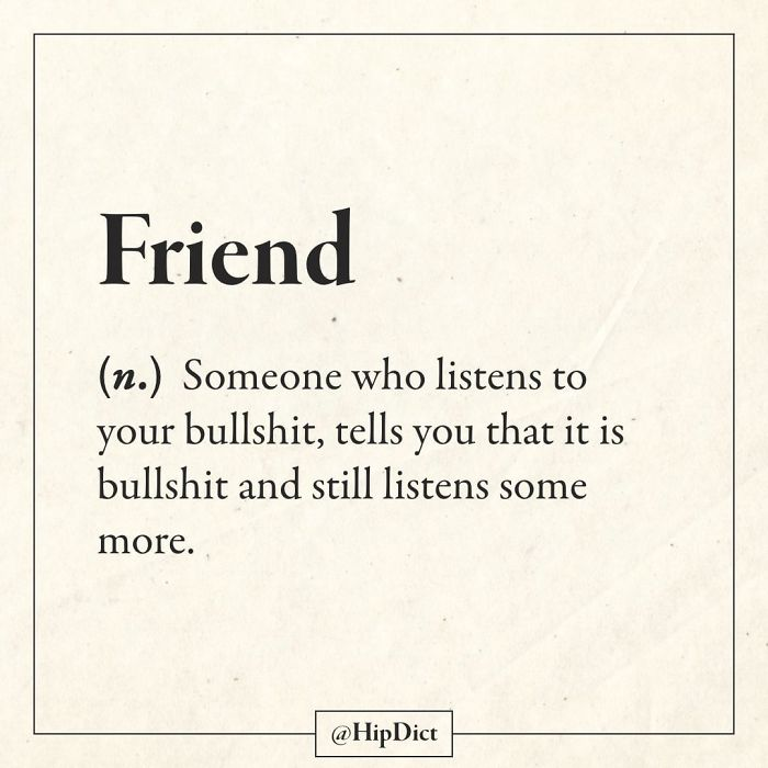 ДРУГ (ПОДРУГА) - человек, который слушает, какую дичь ты втираешь, говорит тебе, что это полная дичь, а затем продолжает слушать дальше.