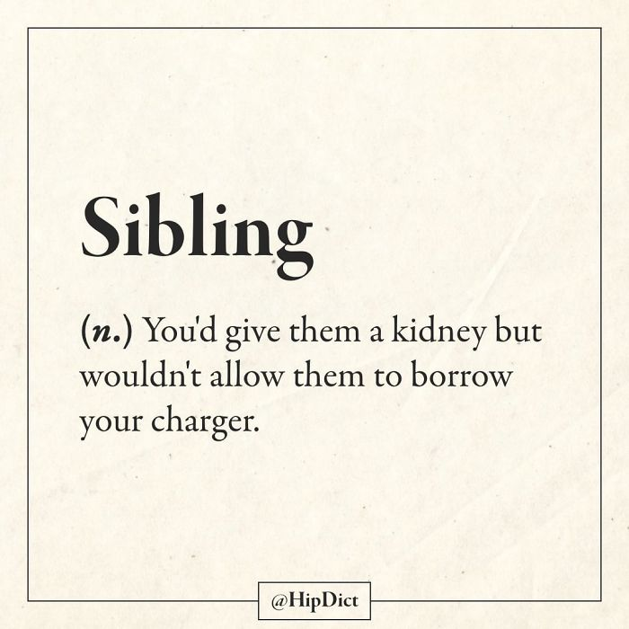 БРАТ или СЕСТРА (сиблинг) - человек, которому ты пожертвуешь почку, но не дашь попользоваться зарядкой для телефона.