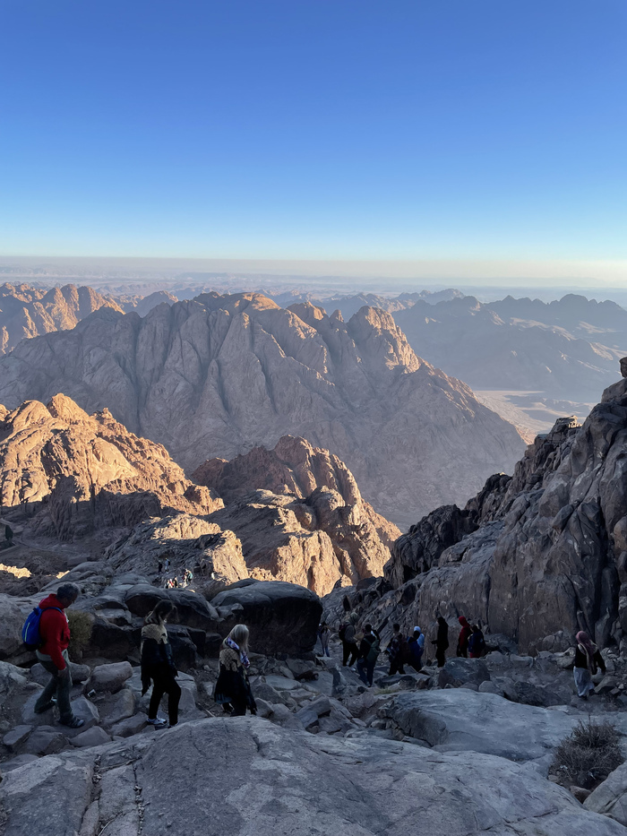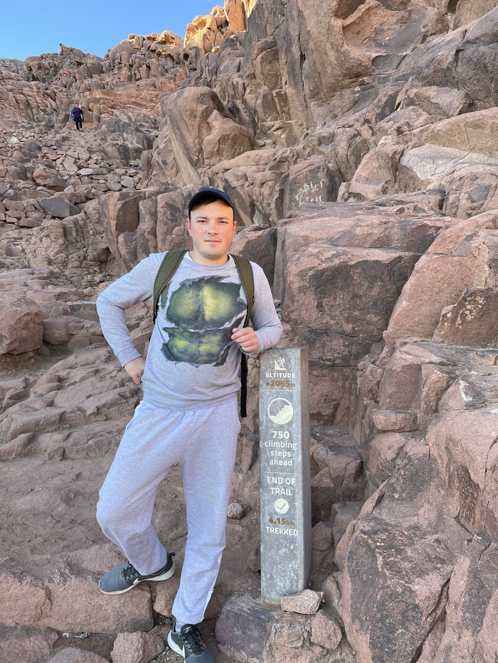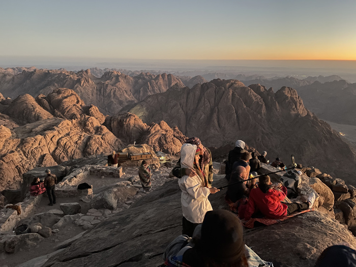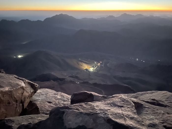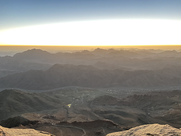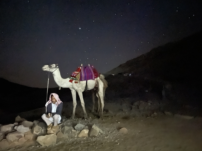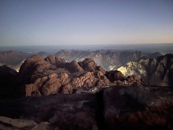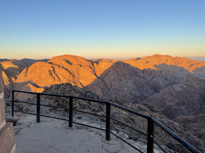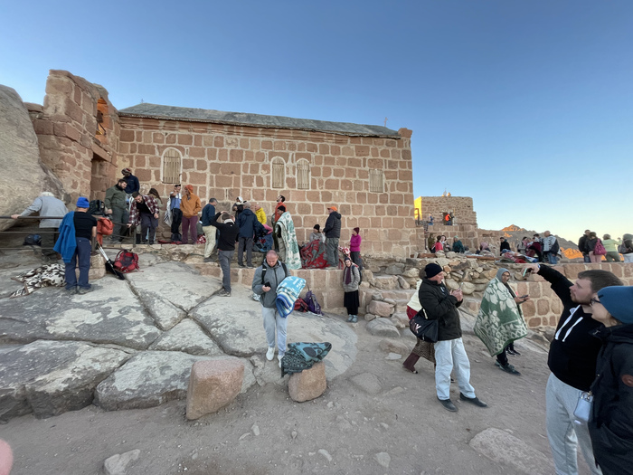 В октябре прошлого года в отпуске были, в Шарм-эль-шейхе (Египет), купили тур на гору Моисея (Синай), а это надо ехать в другой город - Сан Катрин (Санта-Катарин). Выехали после ужина в отеле, ехать около 3-4 часов. Кривоговорящий на русском гид-араб и водитель не му-му на нашем. Всю дорогу между собой болтали, но ТАК громко, почти крича, что бесило, а им это норм. В общем, доехали, после заката начали подъем в гору. Сначала было легко и весело, но уклон всё круче и круче, выше уже бедуины предлагали на верблюде верхом подняться. Но мы без денег да и животину жалко. Судя по времени на фотках, поднимались с 01:30 по 05:00 - 3,5 часа, с остановками. Прохладно, что намотал шорты из рюкзака на шею. Последний этап перед вершиной это 750 ступенек высотой до полуметра (ступенькой назвать сложно). На самой верхушке холодно, жуть - пришлось в аренду взять одеяло, чтобы согреться. В общем, встретили восход (потеплело), пофоткались и можно спускаться. Ноги забитые, спускаться вроде легче, но не легче - уклон толкает бежать. Спускались около 2,5-3 часа. Устали сильно. Когда все сели обратно в микроавтобус, поехали в наш город. А эти гид и водитель, не покорившие гору в эту ночь вместе с нами, так и продолжили о чем-то своем болтать очень громко, хотя весь автобус пытался хоть немного поспать на неудобных сидениях. Вроде кто-то даже попросил их потише говорить, но не проходило много времени, когда базар снова возвращается. Но зато араб каждый раз напоминал, что неплохо было оставить водиле чаевые, якобы это его основная зарплата. Т.к. туристы с разных отелей, нас развозили и, каждый раз, оставляя людей, возмущались, почему это им никто не оставляет чаевых.