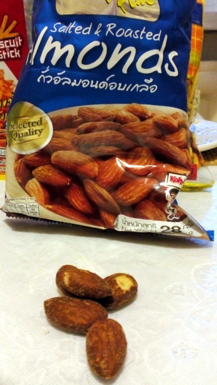 Миндальные орешки, жареные и со вкусом, то ли салями, то ли Бог знает чего, оказались довольно неплохими. Вкусными их назвать язык, все таки, не поворачивается, и сам бы я второй раз их не купил.