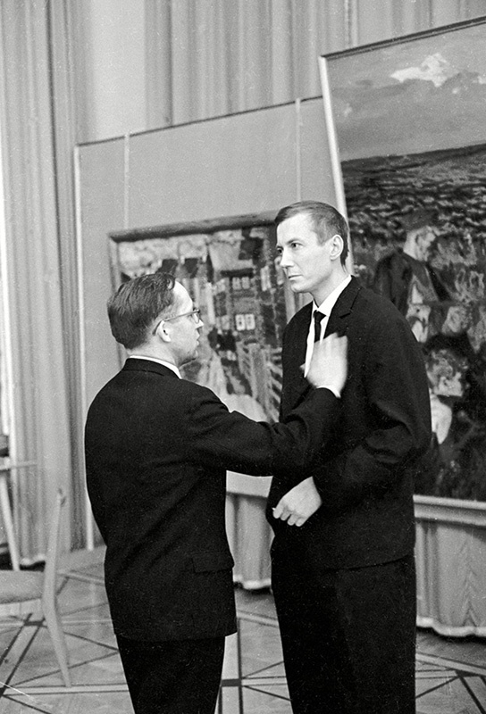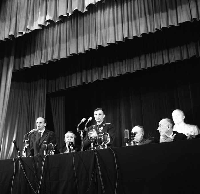 Первая пресс-конференция Юрия Гагарина после полета. Вручение золотой медали имени К.Э. Циолковского. 15 апреля 1961 г.