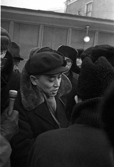 Ярославский вокзал. Китайский студент дает интервью перед высылкой на родину после событий на Красной площади. 25 января 1967 г.