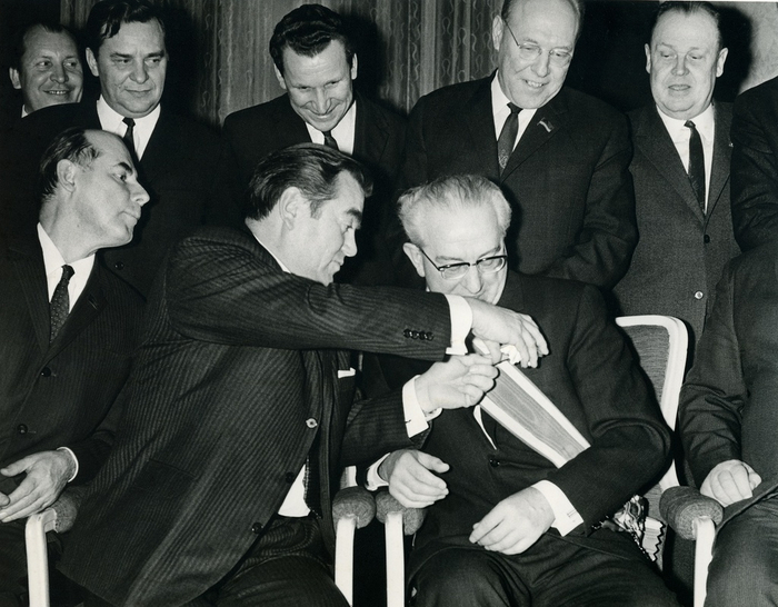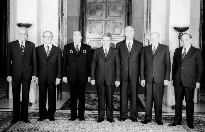 Леонид Брежнев с руководителями стран социалистического лагеря. Слева направо: Густав Гусак (ЧССР), Эрик Хонеккер (ГДР), Леонид Брежнев, Николае Чаушеску (СРР), Эдвард Герек (ПНР), Янош Кадар (ВНР) и Тодор Живков (НРБ). 1973 г.