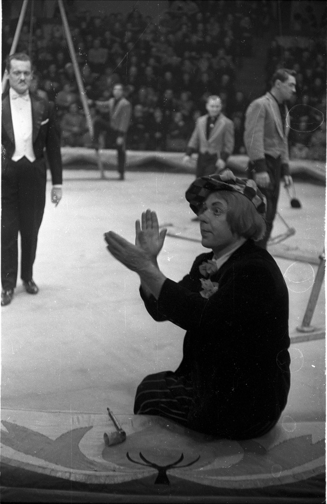 На манеже «солнечный клоун» Олег Попов. Цирк на Цветном бульваре. 1970-е.