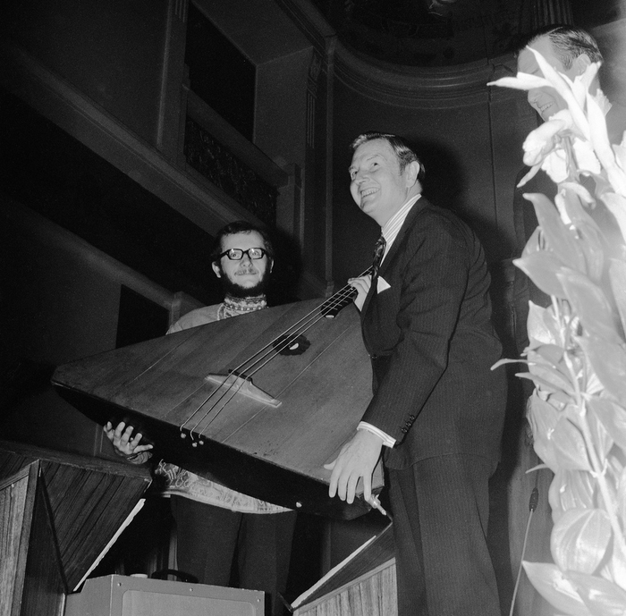 Дэвид Рокфеллер с балалайкой-контрабас. Гала-прием в честь открытия московского отделения Chase Manhattan Bank. Май 1973 г. Отель «Метрополь».