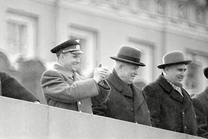На трибуне Мавзолея Юрий Гагарин и Никита Хрущев. 14 апреля 1961 г.