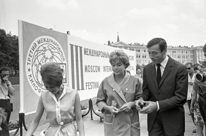 Французские актеры Ив Монтан, Франсуаза Арнуль и Симона Синьоре в Москве. 1963 г.