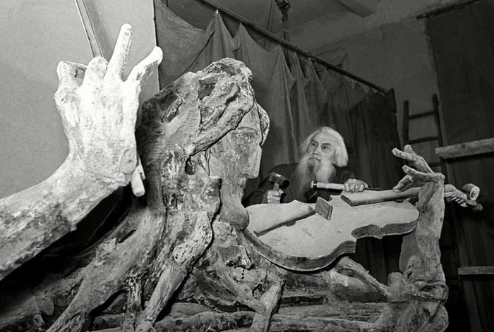 Скульптор Сергей Коненков работает над скульптурой Паганини. 1970 г.