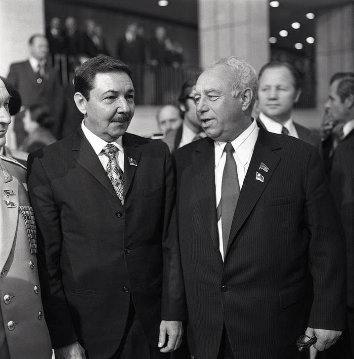 Рауль Кастро, министр обороны Кубы и генерал-лейтенант Алексей Дмитриевич Бесчастнов в Кремлевском дворце съездов. март 1985 г.