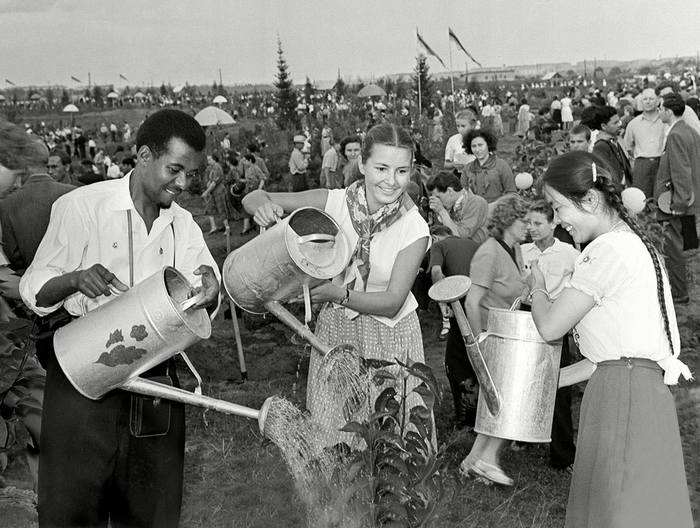 г. Москва. ул. Флотская. Делегаты Всемирного фестиваля молодежи и студентов сажают «Сад Дружбы». 1957 г.