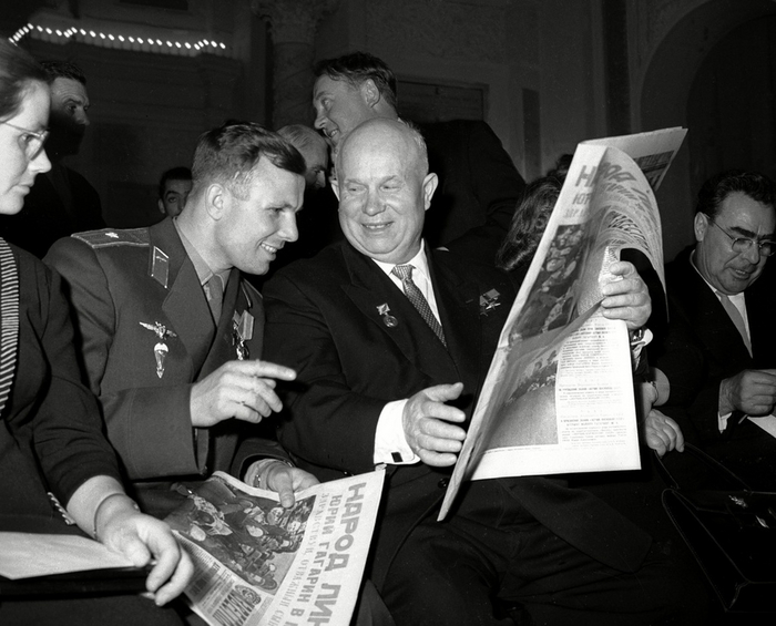 Юрий Гагарин и Никита Хрущев просматривают свежий номер газеты «Известия», посвященный первому полету человека в космос. На втором плане – главный редактор газеты «Известия» Алексей Аджубей.
