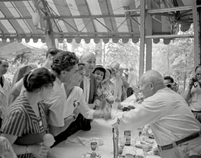 Московская обл., с. Семеновское. Встреча Никиты Хрущева с творческой интеллигенцией на сталинской даче. Среди гостей – Сергей Бондарчук, Нонна Мордюкова. 1961 г.