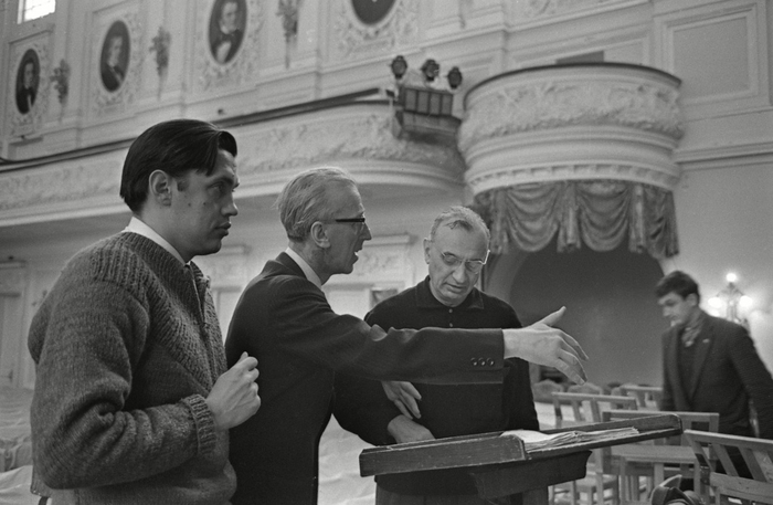 Поэт Роберт Рождественский и композитор Дмитрий Кабалевский на репетиции «Реквиема» в Большом зале Московской консерватории. 1962 г.
