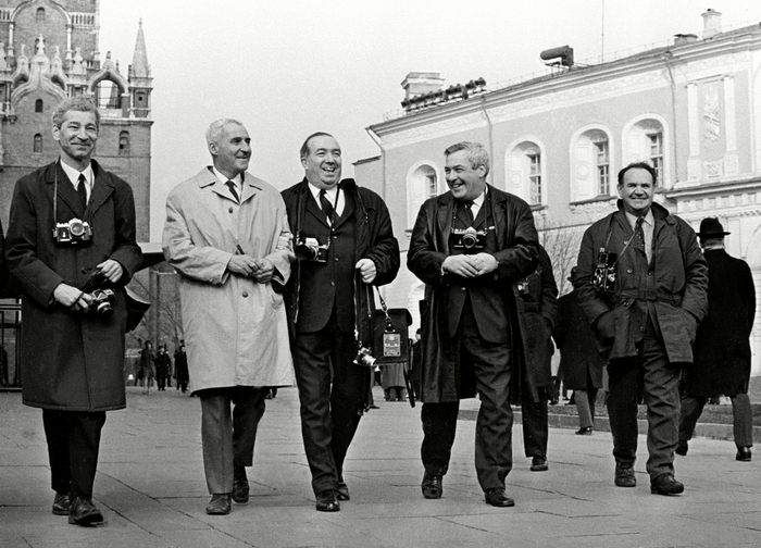 Фотожурналисты (справа налево) Евгений Халдей, Дмитрий Бальтерманц, Самарий Гурарий, Алексей Стужин и писатель Константин Симонов в Кремле. 1974 г.