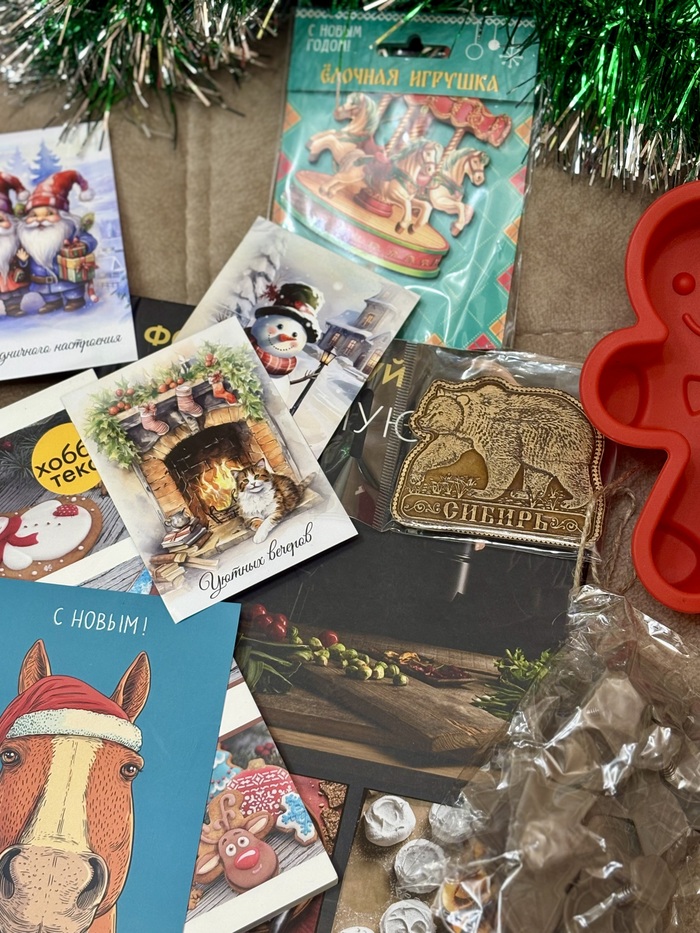 Приехал мой подарок ко мне из далека. Доехал в целости и сохранности. Коробка и каждый подарок были упакованы в подарочную бумагу, к подарку шла открыточка с таинственным описанием. Интрига👍