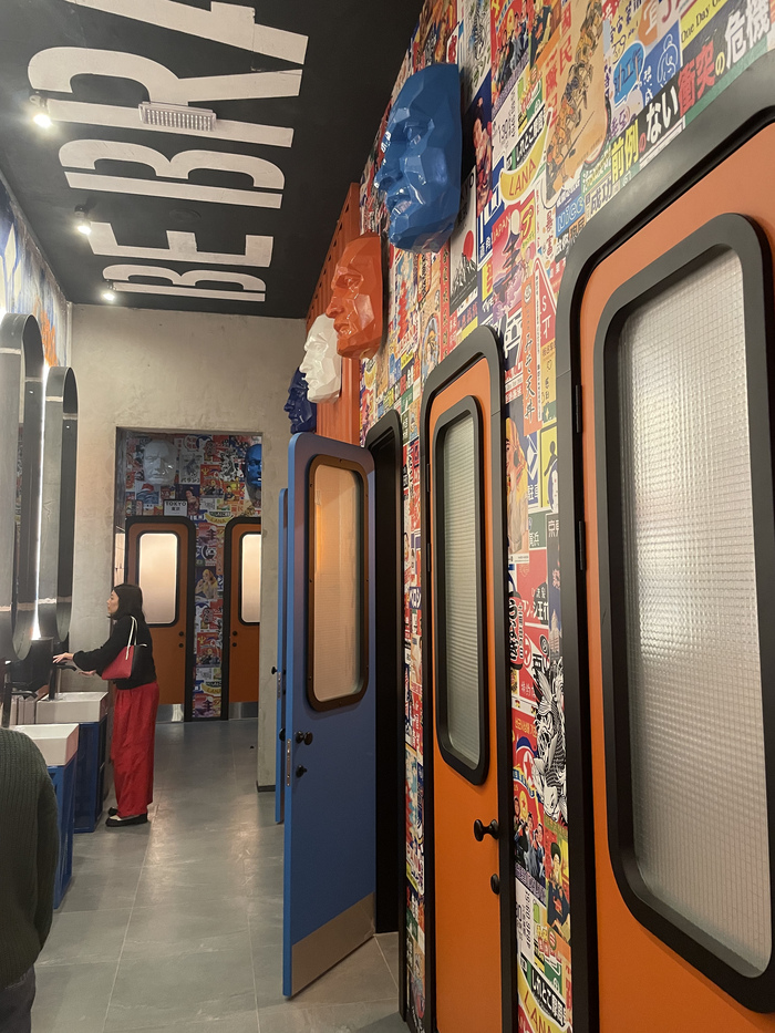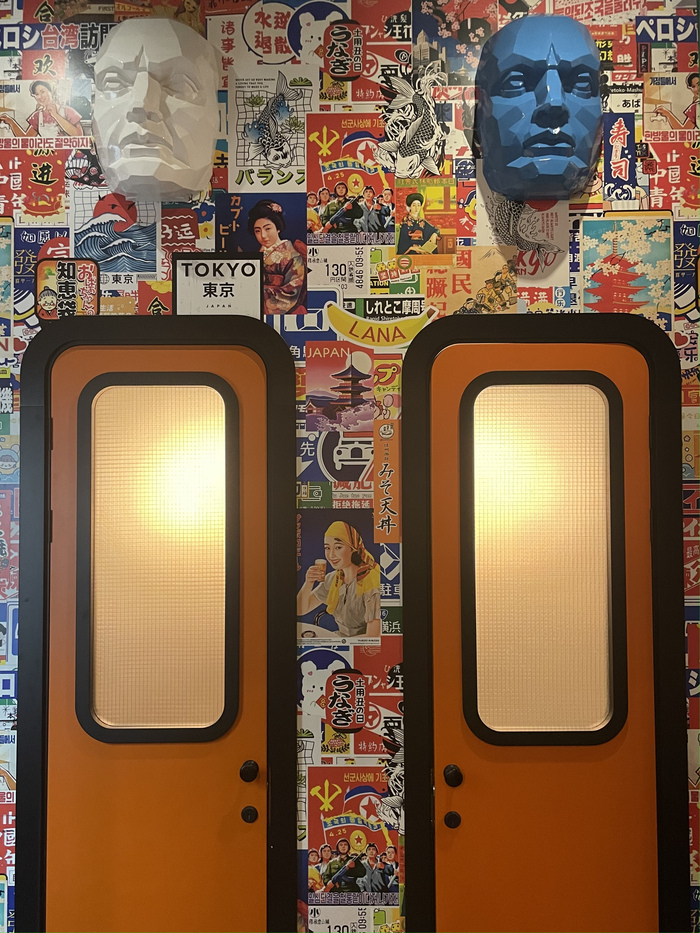 Стилистика туалетов с Азиатскими постерами и головами а-ля компания ВИД или персонажей из "Игры в кальмара" над кабинками.