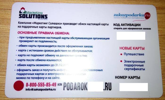 А ситуация следующая: руководство моей конторы, дабы порадовать работников и поздравить их с Новым Годом подарило сотрудникам Универсальные подарочные карты Marketing Solutions, которые можно обменять на подарочные карты различных магазинов до 31.12.2019. Наше руководство так радует своих сотрудников не первый год. Ранее, в прошлые года, я обменивал карту в декабре, сразу после получения. В этот раз, я был в длительной командировке (привет Поморам!), и получил карту только в начале февраля и не могу обменять её… Сотрудники этой самой компании отмораживаются по любым поводам,- то курьер заболел, то курьер позвонит, ждите (ага, уже месяц жду), сам приезжал к ним в офис, предварительно позвонив и уточнив, что сам заберу эти злосчастные карты, и … а карты у курьера, гы. На просьбу дать хотя бы номер этого загадочного курьера, отвечают, что у них нет его номера, т.е. они сами не могут связаться со своим же сотрудником!? Бред же!