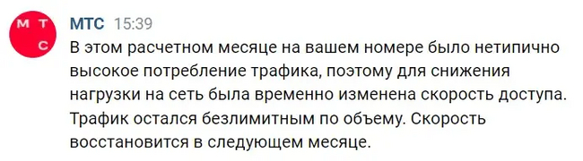 Ах, вот оно из-за чего скорость у меня с самого утра резко упала до 0,1-0,5 Мбит/с (входящее) и 1-1,4 Мбит/с (исходящее). А я должен быть ясновидящей Вангой, чтобы это предвидеть и быть готовым к будущим ограничениям от МТС — так думает МТС?