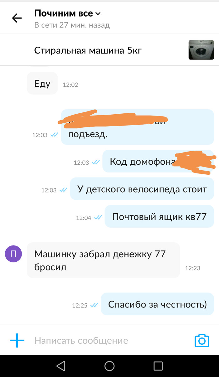 Время идёт, стиралка мешает, так и выставил ее на лестничную площадку (не в ущерб соседям). Ну и написал потенциальному покупателю.