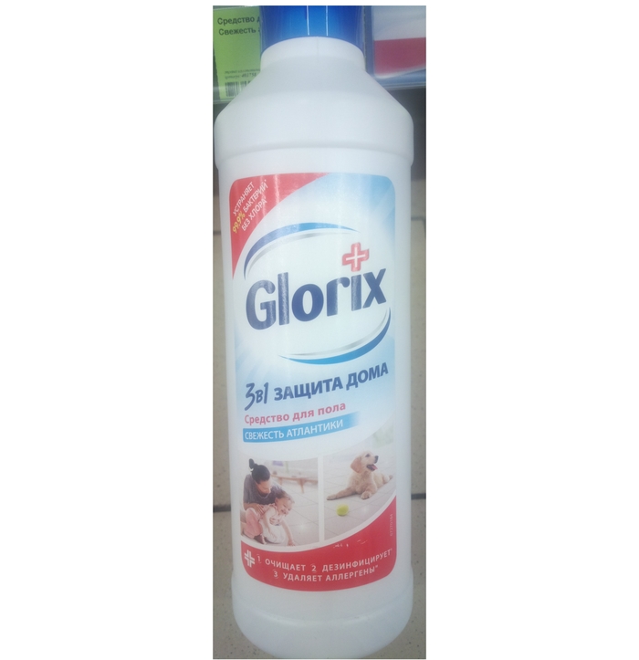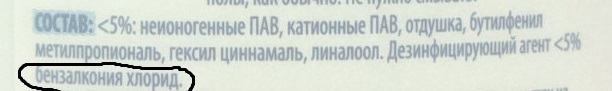 Данное средство для пола попало в мой список, хотя не содержит ни активного хлора, ни активного кислорода. Зато содержит бензалкония хлорид, самый распространенный вариант из четвертичных аммониевых оснований (ЧАС), прекрасно подходящих для дезинфицирования всего и вся.