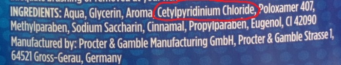 А вот представленный ниже экземпляр содержит в своем составе достаточно серьезный ЧАС - цетилпирридиния хлорид, который активен по отношению к вирусам в целом, и к коронавирусу в частности.
