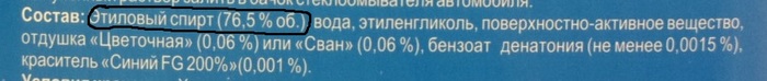 После отдела бытовой химии мой путь пролегал через прилавки с различными автомобильными и около автомобильными средствами. Там особенно ничего интересного обнаружить не удалось, только концентрат "стеклоомывайки" в котором замечен 76,5% этанол. К сожалению, вместе с этанолом присутствует и т.н. антифриз - этиленгликоль. Хотя ядовитым этот компонент является только при приеме внутрь (антидот, кстати, этанол). Но пить этот концентрат будет тяжело, вещество "денатония бензоат" - денатуратор (=очень очень очень горькое вещество). Но для того чтобы дезинфицировать перчатки/ОЗК на крайний случай такая стеклоомывашка пойдет. Кожу наверное я бы протирать не стал из-за красителя.