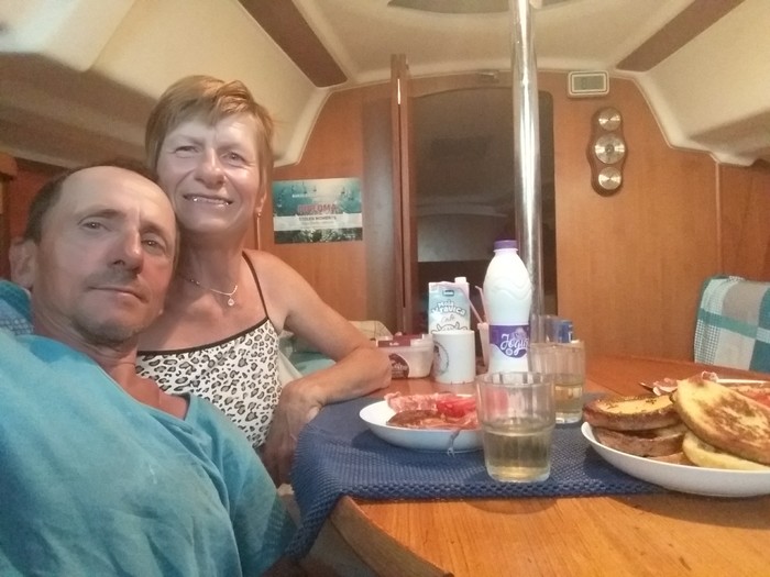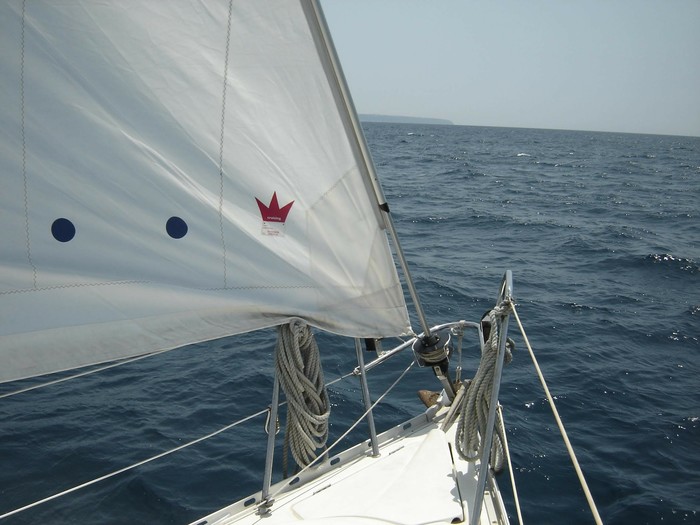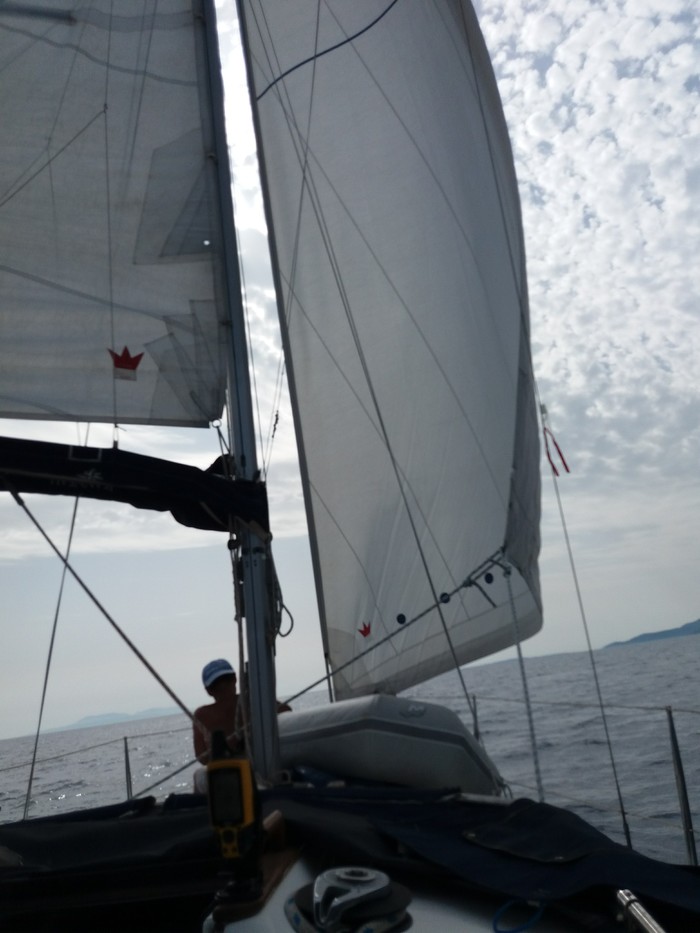 УТРОМ встали в 6 часов. Ветер южный дул и Саша очент торопился пойти. Я только смогла 2 ложки каши съесть, а он уже завел мотор. Я успела одеть майку и трусы и выскочила помогать сняться с якоря. Мы близко стояли к берегу. Сработали хорошо. Он вытаскивал якорь,а я выруливала. Пошла кашу доедать и кофе допивать, а Санек уже вышел в море. Не пошел между островами. Началась качка. Кое как доела. Посуду в мойку. Сижу и не знаю как сделать 2 шага на выход. А надо было ещё что-то одеть! Санек тапки и шорты мне натянуть помог. Вытащил на палубу. Успел мне вынести кофту и безрукавку. Сам был в шортах и джемпере. И началось! Раздуло до 20 узлов. Волна 1-1,50 м. высоты Дул фордак. Мы не рифелись. Неслись под одним гротом со средней скоростью 7-7,5 узлов. Автолидок отказалась работать и Санек почти всю дорогу сам рулил. Нагрузка на руль была отгромная. Он с силой удерживал лодку на курсе. Шаг влево и грод может переникнуться, а это грозит поломкой мачты. Два раза на гребне острой волны перо руля выпрыгивало из воды и лодка теряла управление и нас разворачивало в брочерк поперек волны. И опять яхта выходила на глессирование от 6 до 8 узлов. А под горку с волны до 11-12узлов. Саша был в восторге! Для речной яхты это просто рекорд.