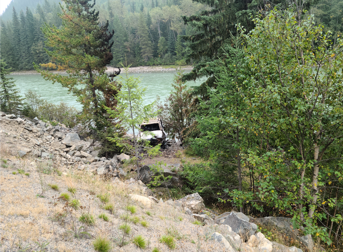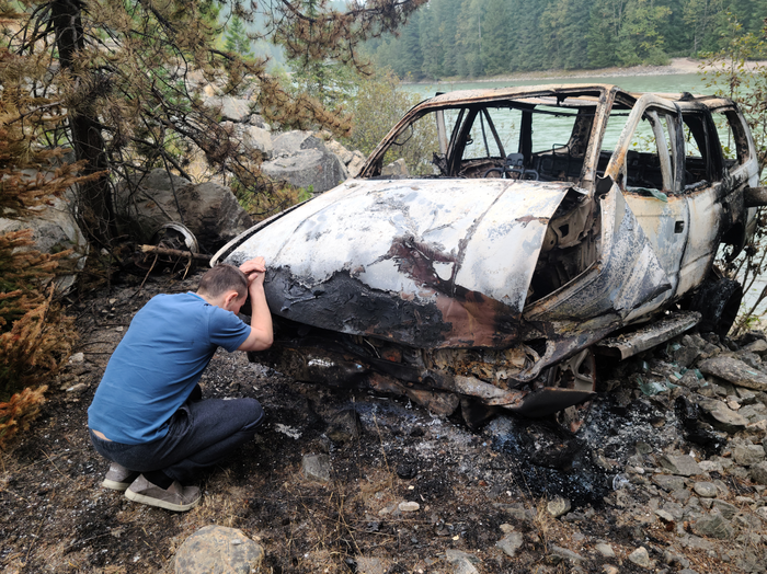 Неделю назад, в понедельник 14 числа, часа в 4 мне позвонил друг. Из госпиталя в Kamloops, BC. Он ездил в Ванкувер за неделю до этого, и по дороге назад слетел с дороги при, казалось бы, небольшом повороте. Толи просто заснул, так как ехал ночью, толи отвлёкся, сейчас уже сам не знает, но в одно мнгновение он на дороге, а в другое летит кувырком в кювет. Так повезло что приземлился на колёса. Очнулся в горящей машине, выбил стекло и вылез через окно, так как дверь заклинило. Машина у него была 2001 года Toyota 4Runner, поэтому здорово помогли подушки безопасности, даже боковые. Вылез и снова отключился. В следующий раз очнулся когда шины стали взрываться и понял что надо от неё лезть подальше. В машине ещё и канистра бензина была, и дрова, и газ для плитки. Парень большой поклонник походов, так что чего там только не было. Выполз на дорогу и там уже его подобрал проезжающий тракер и помог добраться до медпомощи. В общем, пробыл в госпитале почти неделю. Получил серьёзные травмы брюшний полости, вырезали немного кишки, зашивали аорту, перелили 2 литра крови. Потом сказали что выписывают и добирайся ка ты до дома сам. А он за тысячу километров от дома, без денег, документов, телефона. Всё осталось в машине. Ну и позвонил мне за помощью. Отпросившись с работы, закупившись энергетиками и кофе, я поехал в ночь и к утру уже был в госпитале. Забрал его и на обратном пути мы нашли со второго раза его машину. Её даже с дороги то не видно. Пока он ещё под обезболивающими был, с 30 сантиметровым швом на пузе, спустился попрощаться с машиной которая спасла ему жизнь. А ведь могла бы быть сотня вариантов как он там мог бы остаться навсегда. Парень родился в рубашке.