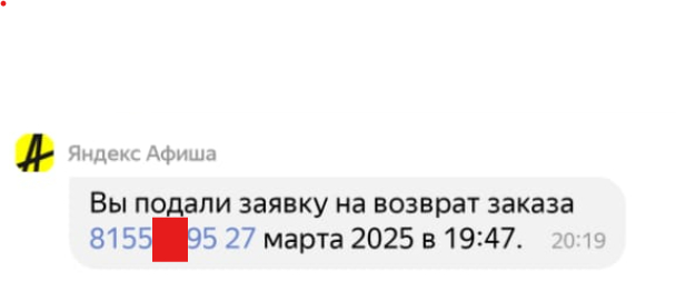 Но на почту билеты не пришли и в личном кабинете не появились. Сразу же (в течение нескольких минут с покупки) обратились в поддержку Яндекс Афиши, на что получили ответ, будто бы был оформлен запрос на возврат билетов! 😦 И, одновременно с этим обнаружили, что вернулось 3200 руб. на карту.