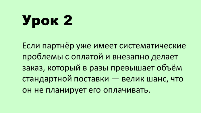 В конце 2016 года от «Правильных игрушек» пришёл заказ сразу на полтора миллиона. Учитывая, что эта сумма в несколько раз превышала сумму стандартного заказа и была сопоставима с суммой всей накопившейся задолженности, я сразу почувствовал неладное и полностью стопнул все отгрузки по контрагенту.