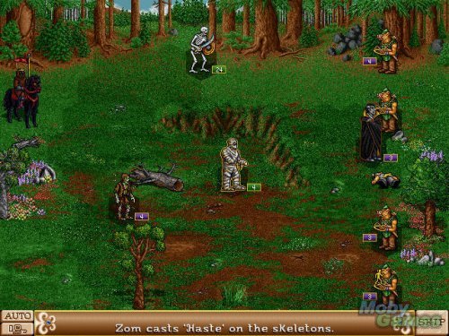 уга-ха-ха, знакомьтесь: символ нашей доблестной армии - скелетон! Жуткая монстра... Чуть уступая «здоровьем» кентаврам, они далеко превосходили всех остальных "первоклашек" по боевым навыкам и наносимому урону, а средняя скорость позволяла перейти поле боя за два хода, если на нем не встречалось препятствий. Собственно, вся стратегия некромантов была завязана на скелетах, и, несмотря на низкую защиту, к концу игры герою почти всегда удавалось накопить порядочное количество скелетов, во-первых, благодаря относительно высокому приросту, а во-вторых - скажи спасибо способности скелетов подниматься из павших вражеских воинов (не в последнюю очередь - благодаря заклинанию "Поднять труп"), так что, при удачном раскладе, некромант мог вообще закончить бой с приростом в армии, так что единственным выходом для вражеских героев было устранить костлявого до того, как его скелеты расплодятся... впрочем, это удавалось отнюдь не всегда, и уж коли некромант натыкался, скажем, на толпу крестьян - так вообще пиши пропало. В общем, здоровский юнит, честь ему и слава!