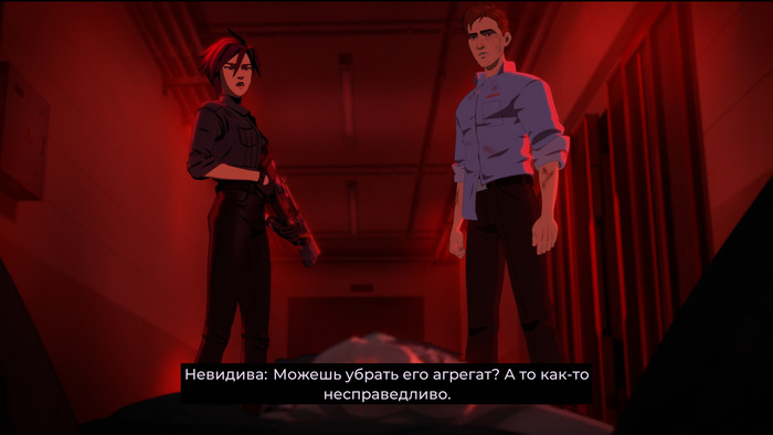 От начала до конца сценарий деградирует, а вот идеи для казуальной игры развиваются и этим радуют! Геймдизайнеры могли бы просто масштабировать комплект начальных элементов, чтобы повысить сложность, но каждый раз, в каждой новой главе была своя новинка, своя идея, неожиданность, внезапность, вызов! Мелочь, кроха, но всё равно приятно. Я даже скажу, что по сравнению с Dispatch взломы в Cyberpunk 2077 и Deus Ex банальны, примитивны и однообразны.