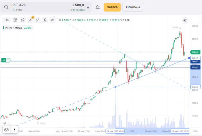 Обычно в этом случае цена движется в небольшом канале рывками без крупных откатов. Перед пробоем возможно небольшое торможение. Обновления локальных экстремумов (перед пробоем) не происходит.