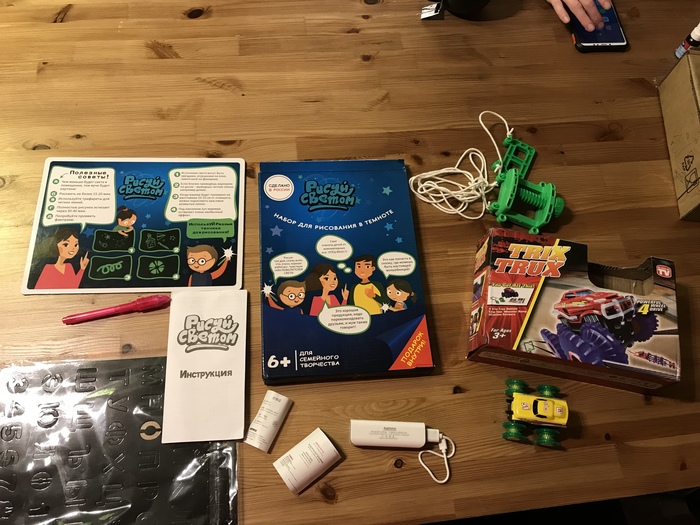 Ввёл свои данные, заказал. На следующий день перезванивают мне. Уверенным голосом рассказывают про стоимость доставки в мой регион в 500р, но предлагают дозаказать к машинке ещё классного стаффа, что я расслышал было - внешний акум и браслет на ребёнка с gsm модулем. И тогда ждёт меня бесплатная доставка и общая стоимость в 3490р. Согласился, начал ждать. Через недельку пришла посылка. Каюсь, не стал вскрывать перед оплатой. Развернул уже дома. Что же оказалось внутри?