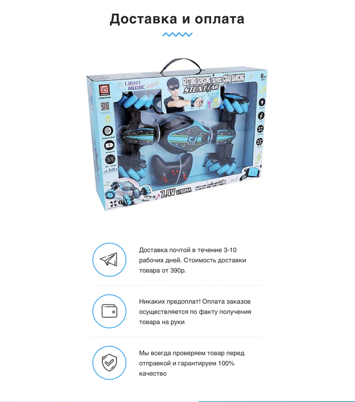 Вот такое счастье. Машинка ну вообще не та. Без пульта с управлением, без аккумулятора, просто на батарейках. И вообще сильно не та, что была вот на этом лендинге.