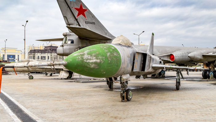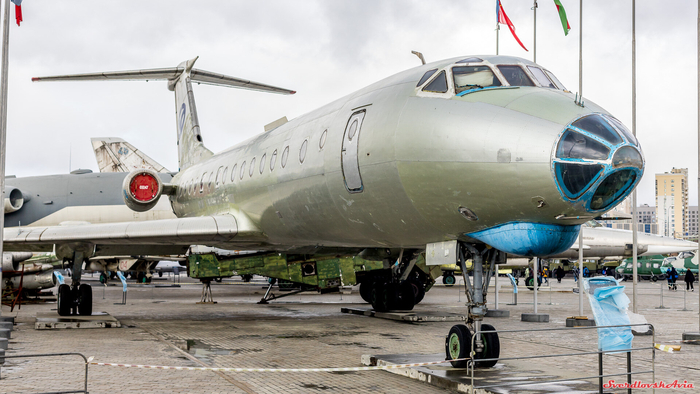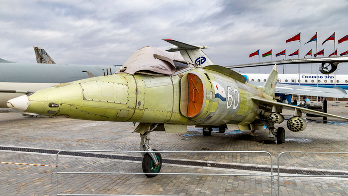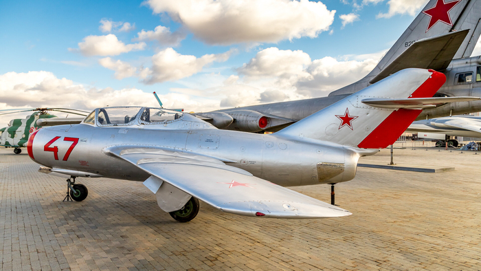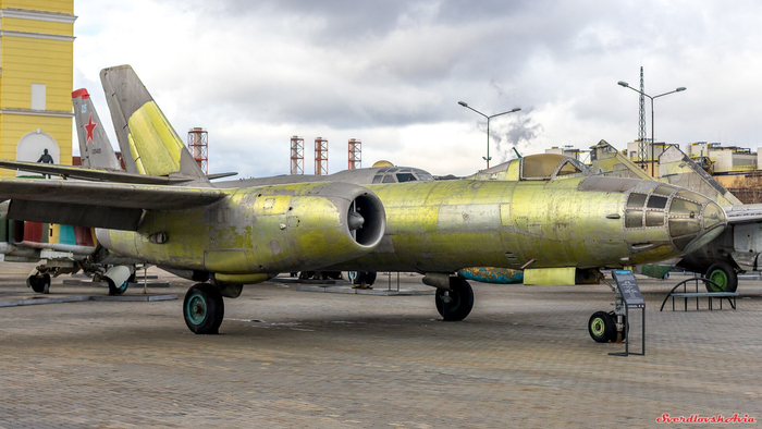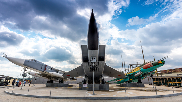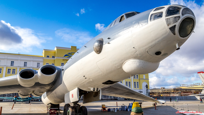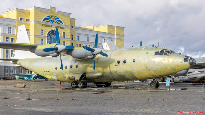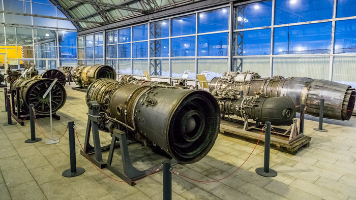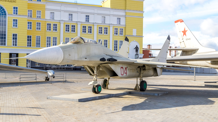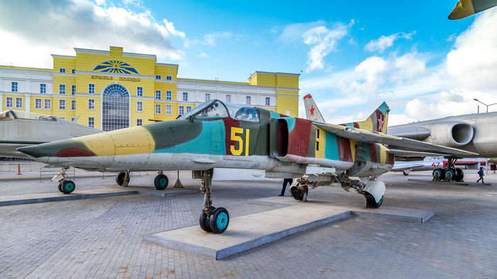 Перед зданием музея расположена открытая площадка, на которой представлена авиационная техника послевоенного периода. Там есть и военные самолеты, как например бомбардировщик М4 и пассажирские. Самолеты в различном состоянии, часть машин уже восстановлена, часть в процессе восстановления, остальные ожидают своей очереди. В крытом павильоне представлены образцы авиационных двигателей и кабины самолетов. (листайте галерею)