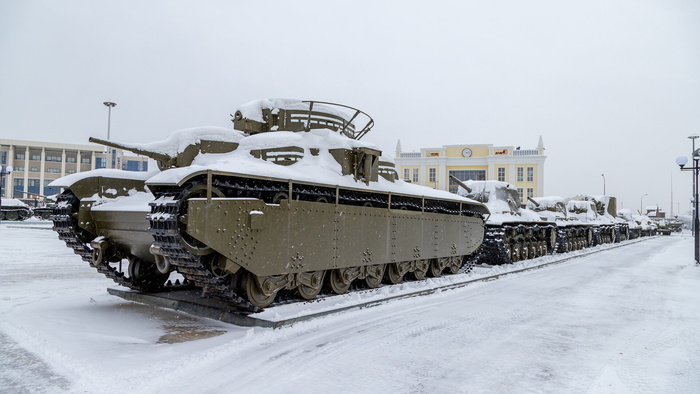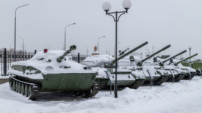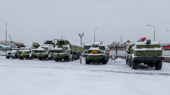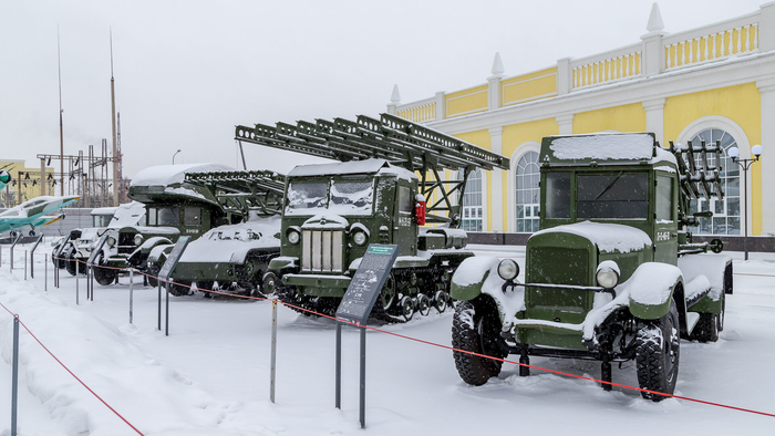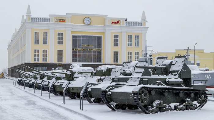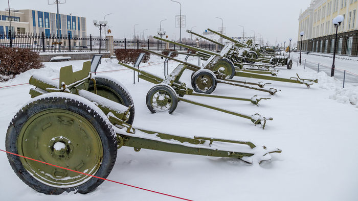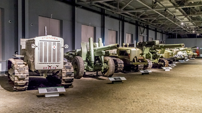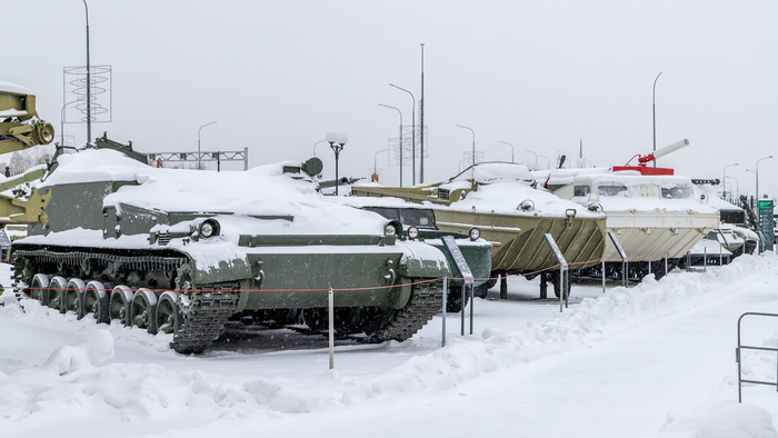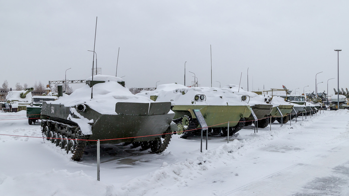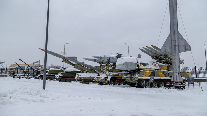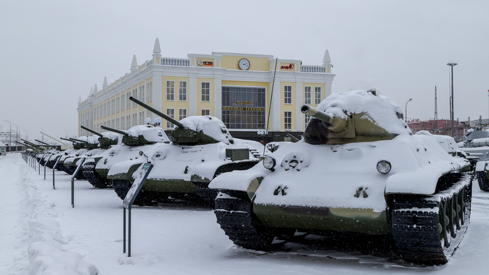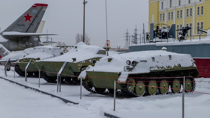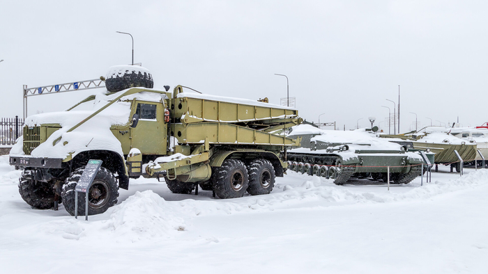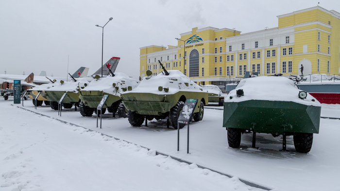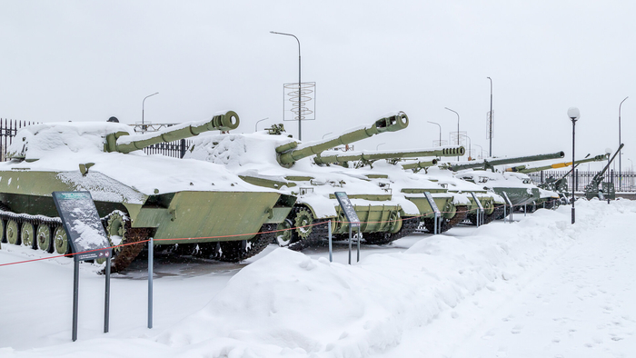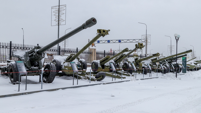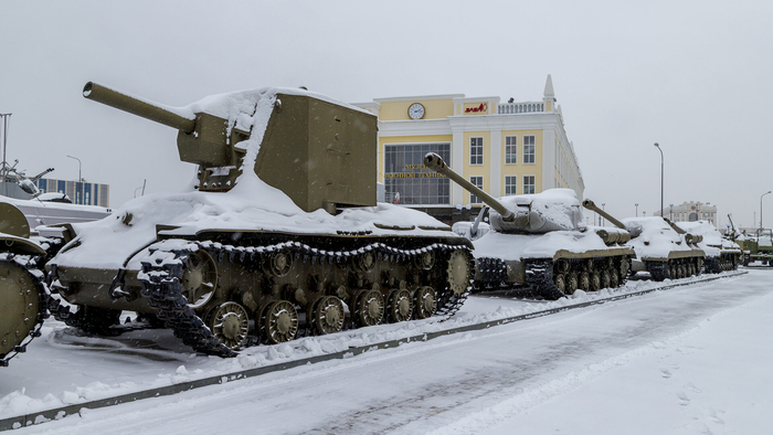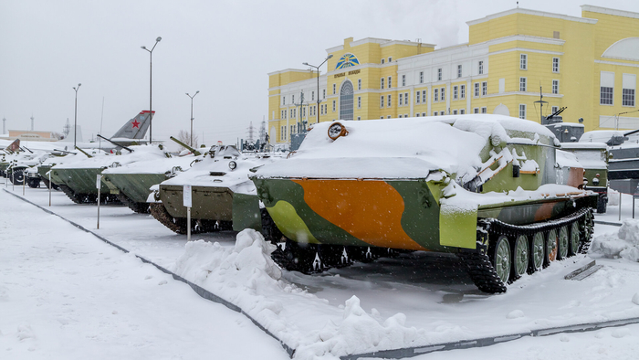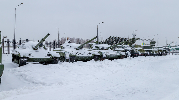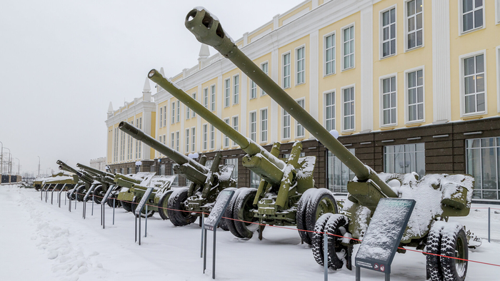 Ну и самая обширная экспозиция - это открытая площадка музейного комплекса, где выставлено несколько сотен экспонатов. Конечно сейчас не совсем подходящее время для осмотра техники на улице, у нас идут снегопады, но представить объем экспозиции можно. Сначала бронетехника и артиллерия. (листайте галерею)