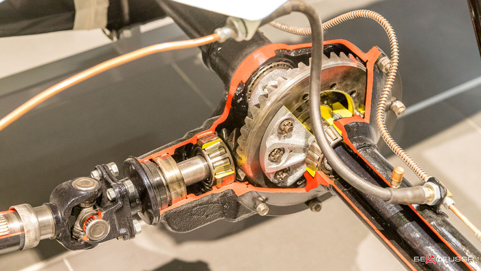 Карданная передача с вырезами шлицевого соединения. Игольчатый подшипник задней крестовины также показан наглядно. Редуктор заднего моста и полуось максимально детализированы.