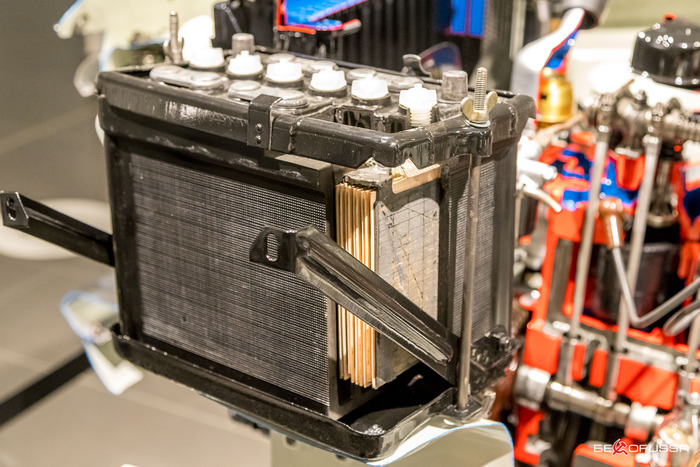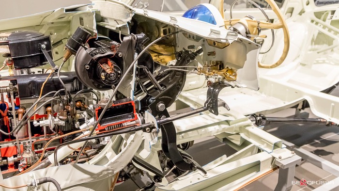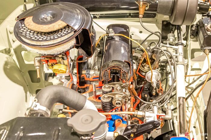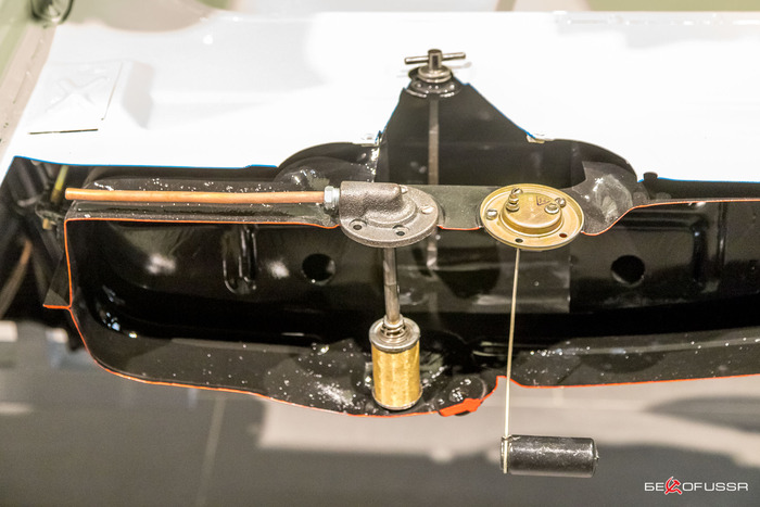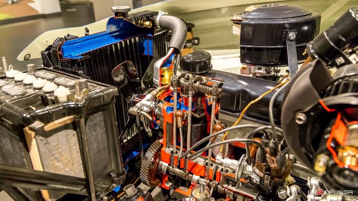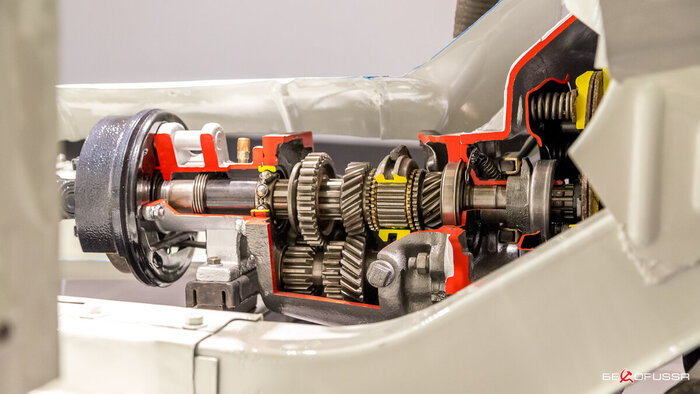 Коробка передач сделана справа по ходу движения. Наглядность механизма сцепления, всех валов, шестерен, подшипников. Втиснуть разрез КПП в общий "дисплей" не получилось, потому что пришлось оставить на месте трубку отопителя салона. Посмотреть КПП можно только справа через "открытую" дверь или через вырез переднего правого брызговика. С того же ракурса сделан вырез кривошипа – наглядность масляных каналов внутри вала и других элементов системы смазки. Всех!