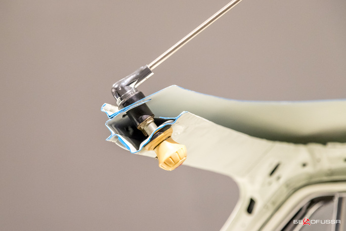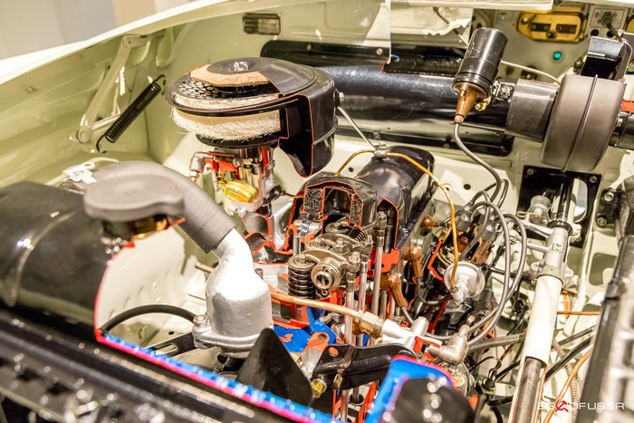 При этом, заказчик строго наказал, чтобы не забыли открыть трубу отопителя, которая направляет поток воздуха в ноги задних пассажиров - существенное отличие кузовов серии 3. Всё понятно – делаем разрез слева по ходу движения. Наглядность системы смазки обеспечиваем дополнительным вырезом кузова справа.